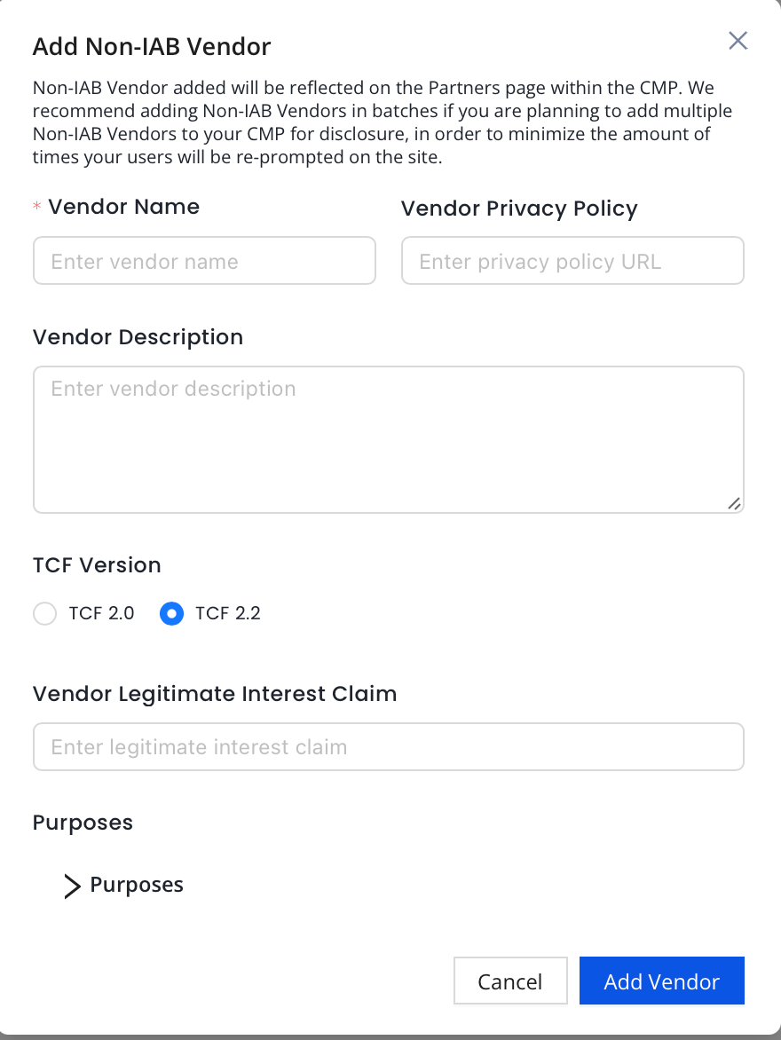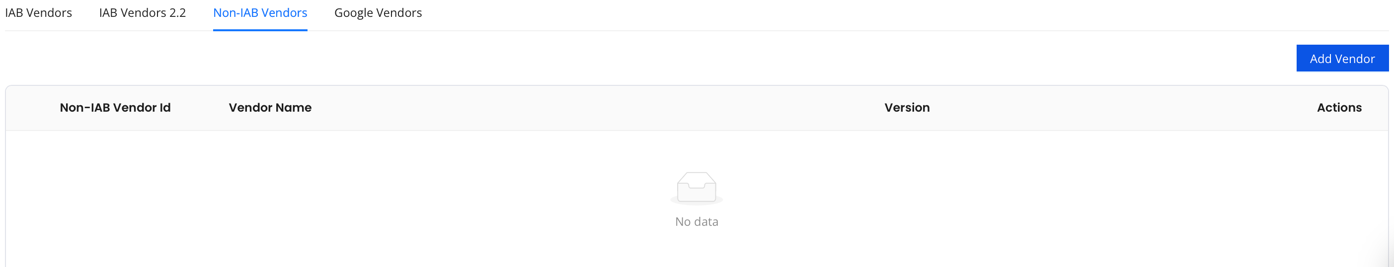 On the InMobi CMP portal, the vendor will be given a non-IAB vendor ID, which will correlate to their position in the non-IAB vendor cookie and the non-IAB vendor API. You will now need to manage these vendor technologies using the non-IAB APIs and/or cookie instructions.