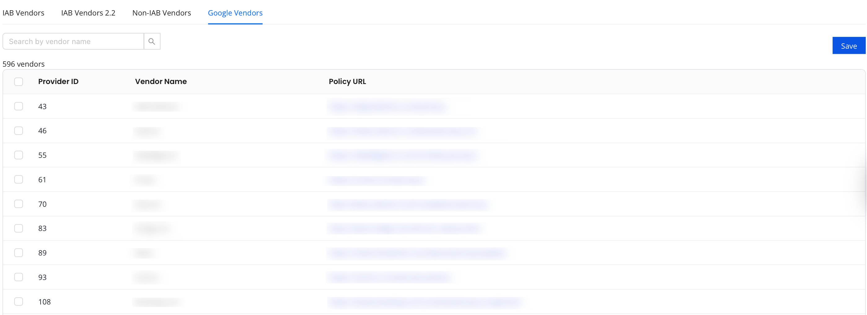 These are vendors that work with Google and are not listed under the TCF vendor list. If you work with Google Ad Manager, you may want to review this list and enable the vendors that you are working with through Google Ad Manager, AdMob, and AdSense. By default, all vendors are selected. For more information, see Ad Technology Providers.