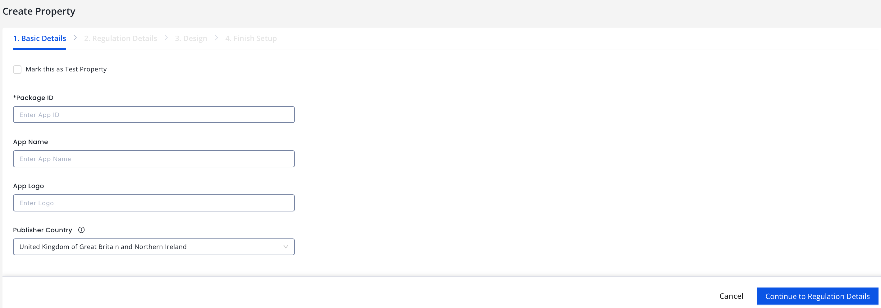 The Property creation process is divided into four sections: