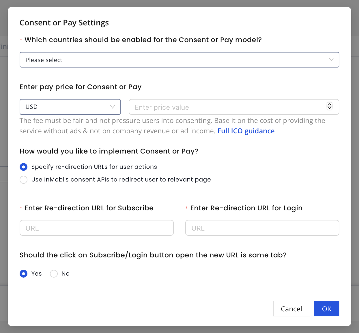Select Yes or No to enable Consent or Pay. For more information, see Consent or Pay.