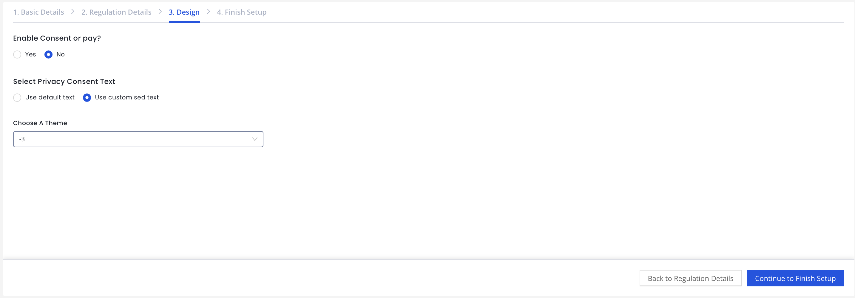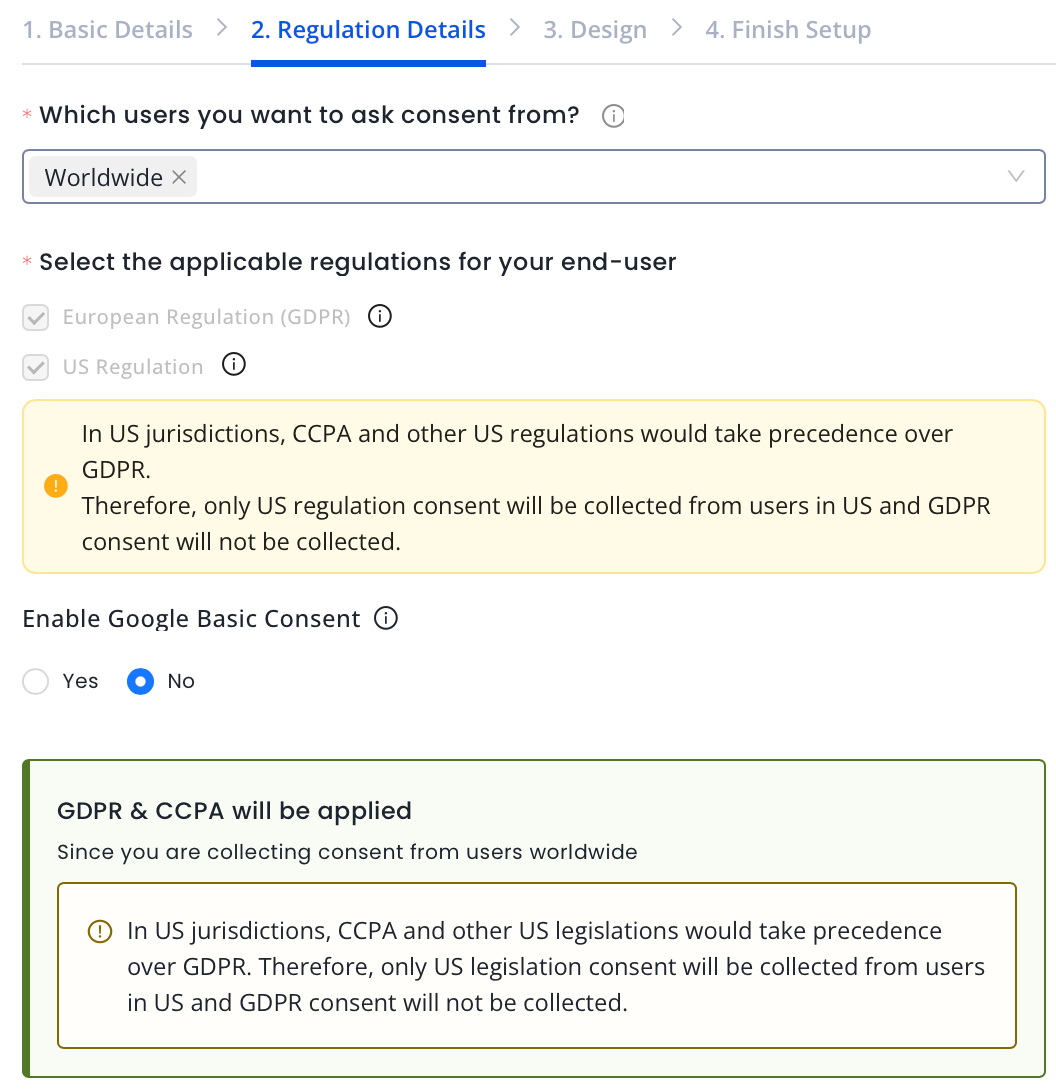 Once you save the basic details for your app, you need to add the regulation details to ensure your app's consent collection is compliant with data privacy laws.