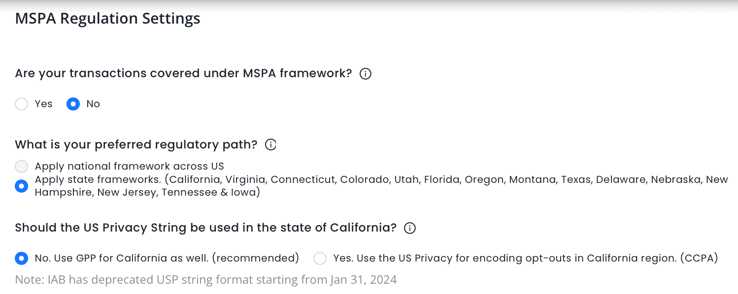We recommend using GPP for California as well, since IAB has deprecated the USP string format starting from Jan 31, 2024.