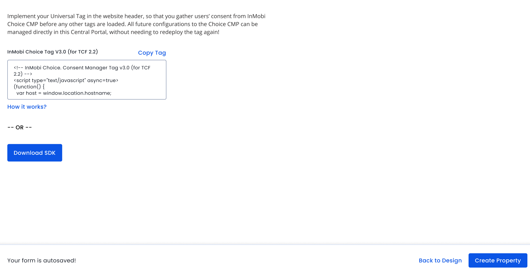 Download Tag or copy/paste the tag in your website's header to collect consent. For more information, see Implementing Web SDK.