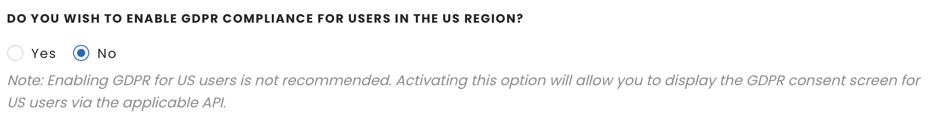 Configure GDPR in the US region: You no longer need to trigger the consent screen by calling the required API if you select Yes. Enabling GDPR in the US is not recommended.