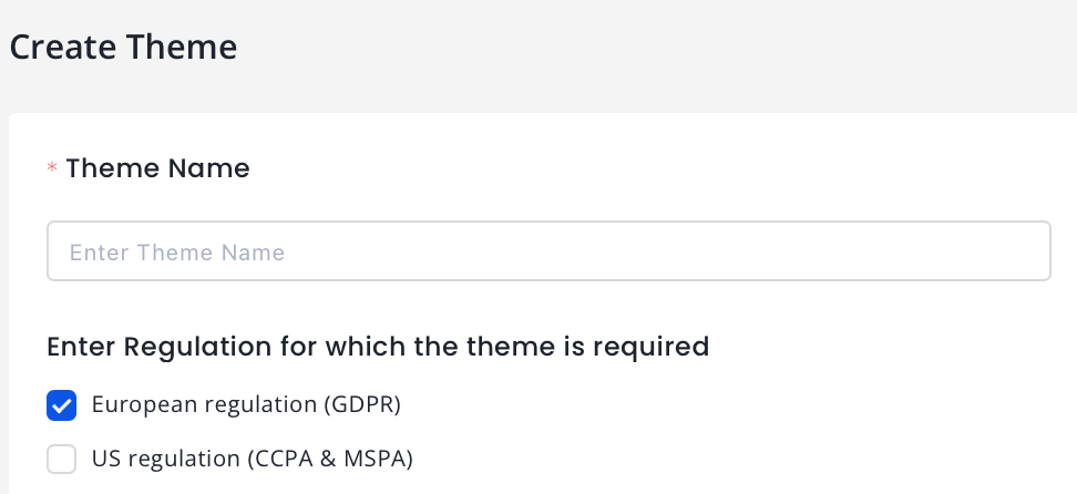 - For Regulation for which the theme is required, select European regulation (GDPR) or US regulation (CCPA & MSPA), or both. For more information, see GDPR and CCPA.