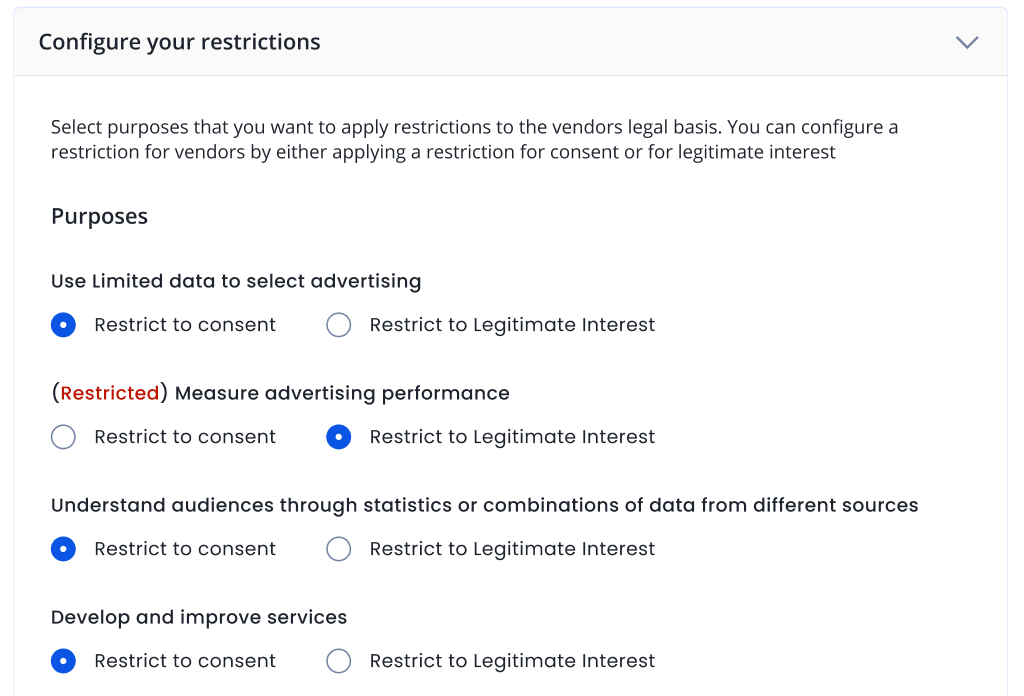 - Select the purposes which you want to apply restrictions to the vendors' legal basis.