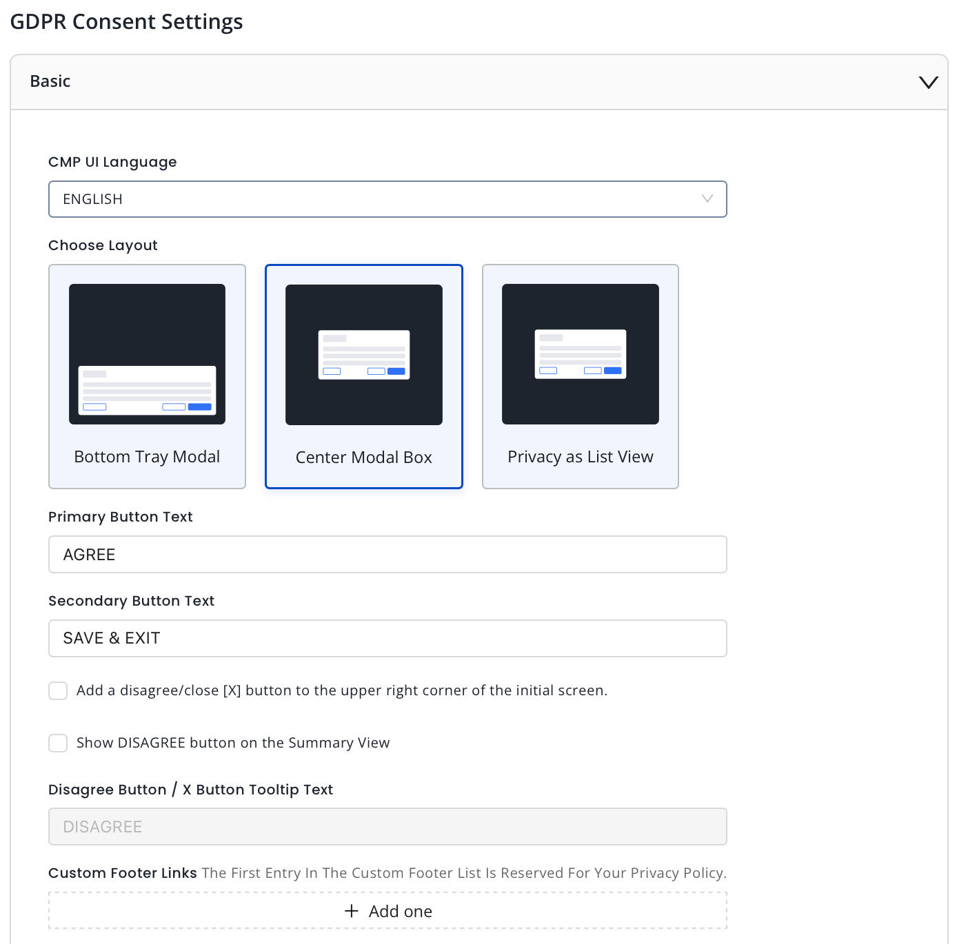 - Enter the desired text for your Disagree button or X Button Tooltip text.