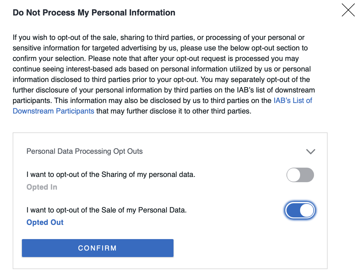 - Select the Suppress MSPA Links checkbox if you only want to support the IAB CCPA Framework. This will suppress the links to the Data Deletion, Data Access, and Data Privacy Policy.