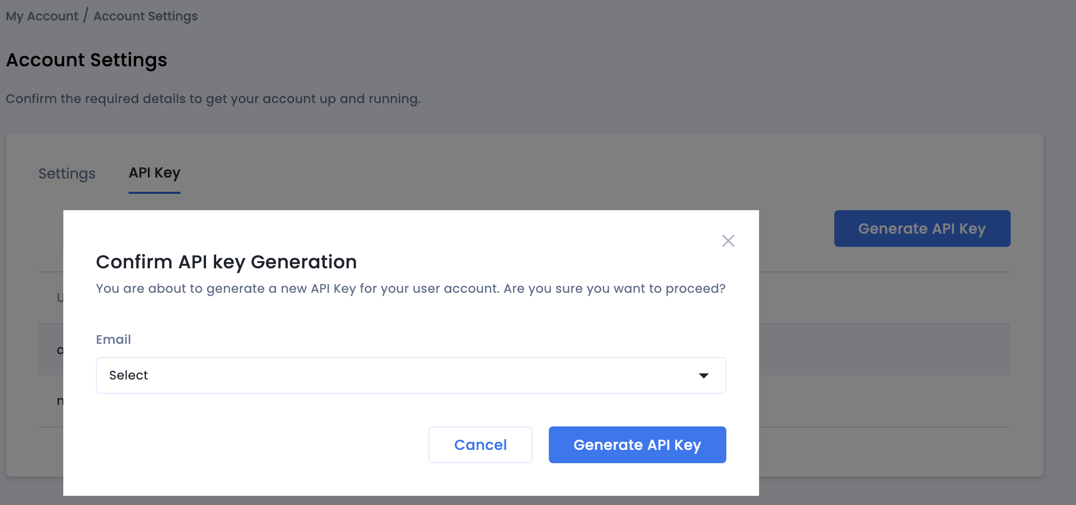 - Go to My Account > Account Settings. Navigate to the API Key tab and click Generate API Key.