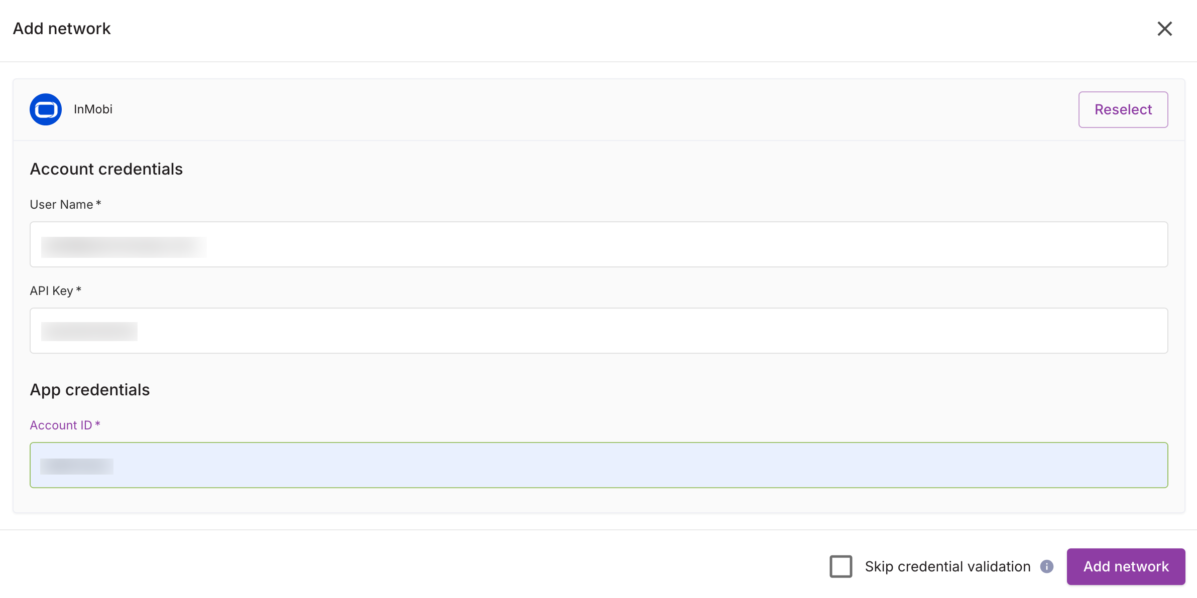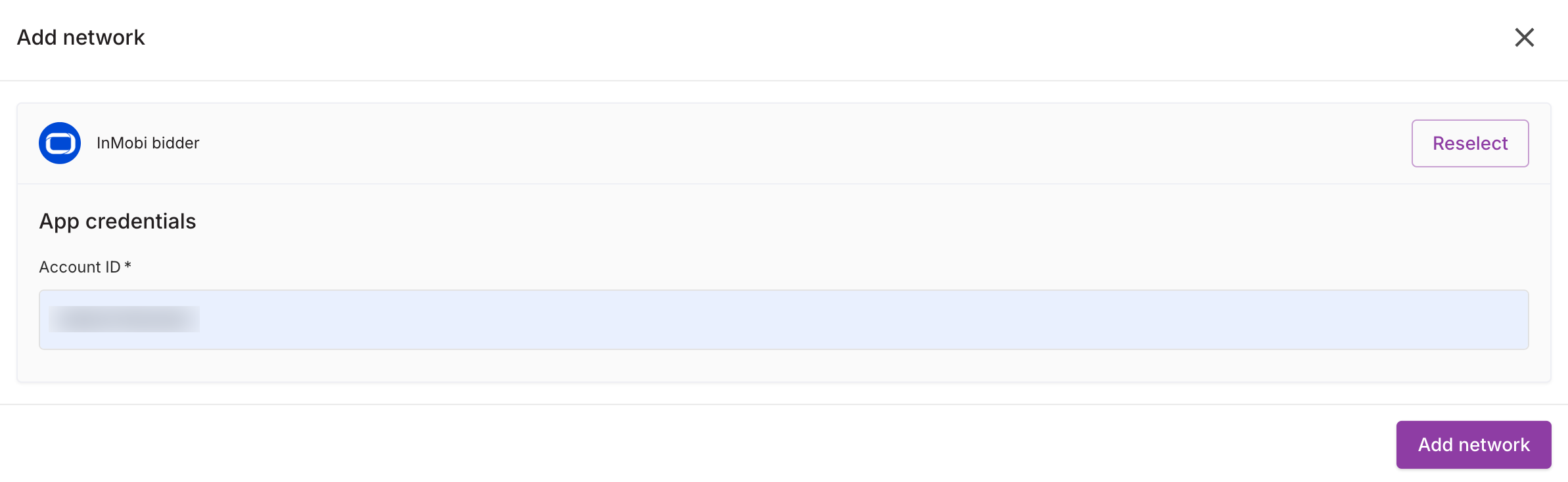 - Set up InMobi or InMobi bidder as a mediated network using your InMobi Account ID and API Key.