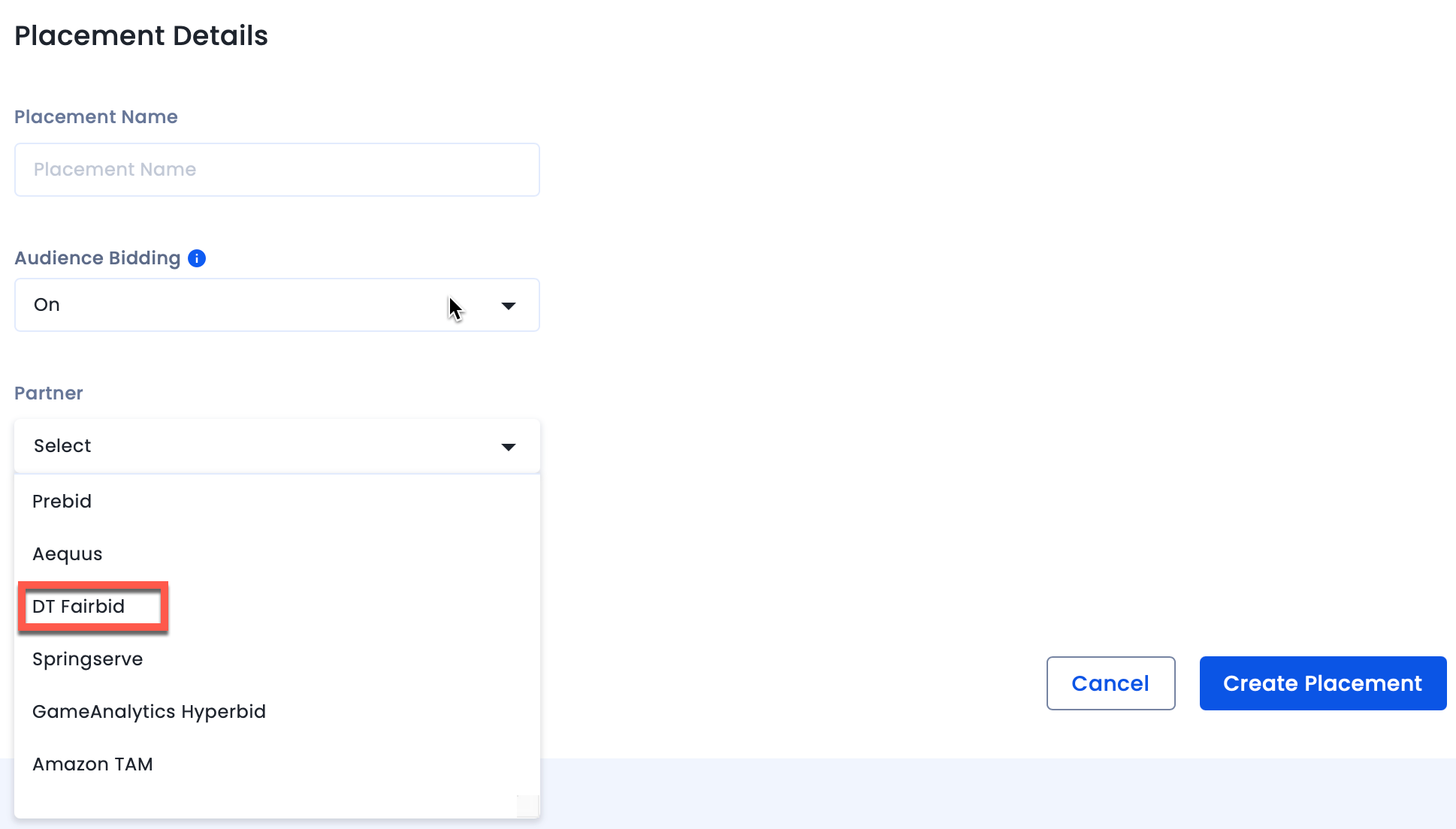 - Name your placement. Enable Audience Bidding and select DT Fairbid from the Partner dropdown.