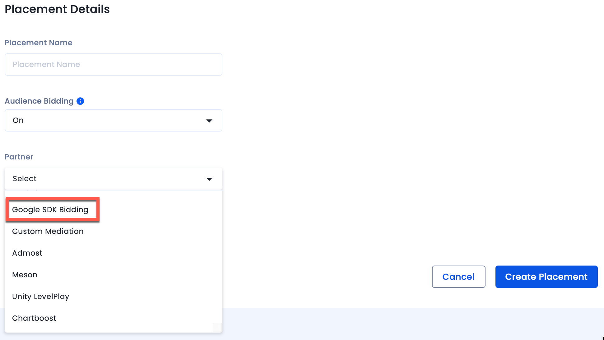 - Name your placement and enable Audience Bidding. Select Google SDK Bidding from the Partner dropdown. Click Create Placements.