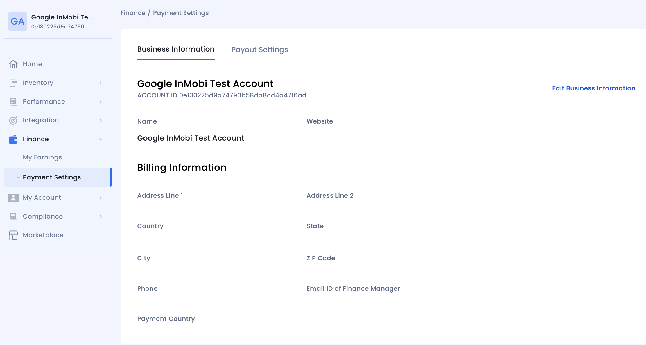 - Your InMobi Account ID is available under Finance > Payment Settings > Business Information.